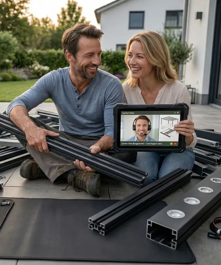 Starten Sie jetzt Ihr Projekt mit Garten Vista. Dank unserer vormontierten Bauteile sparen Sie bis zu 40 % Ihrer wertvollen Montagezeit. Gehen Sie kein Risiko ein: Mit unserer exklusiven Baugarantie® sind unsere Experten bei Bedarf per Video-Call live an Ihrer Seite. Profitieren Sie von unserer niederländischen Qualität und der kostenlosen Lieferung direkt zu Ihnen nach Hause innerhalb von 5–10 Werktagen.