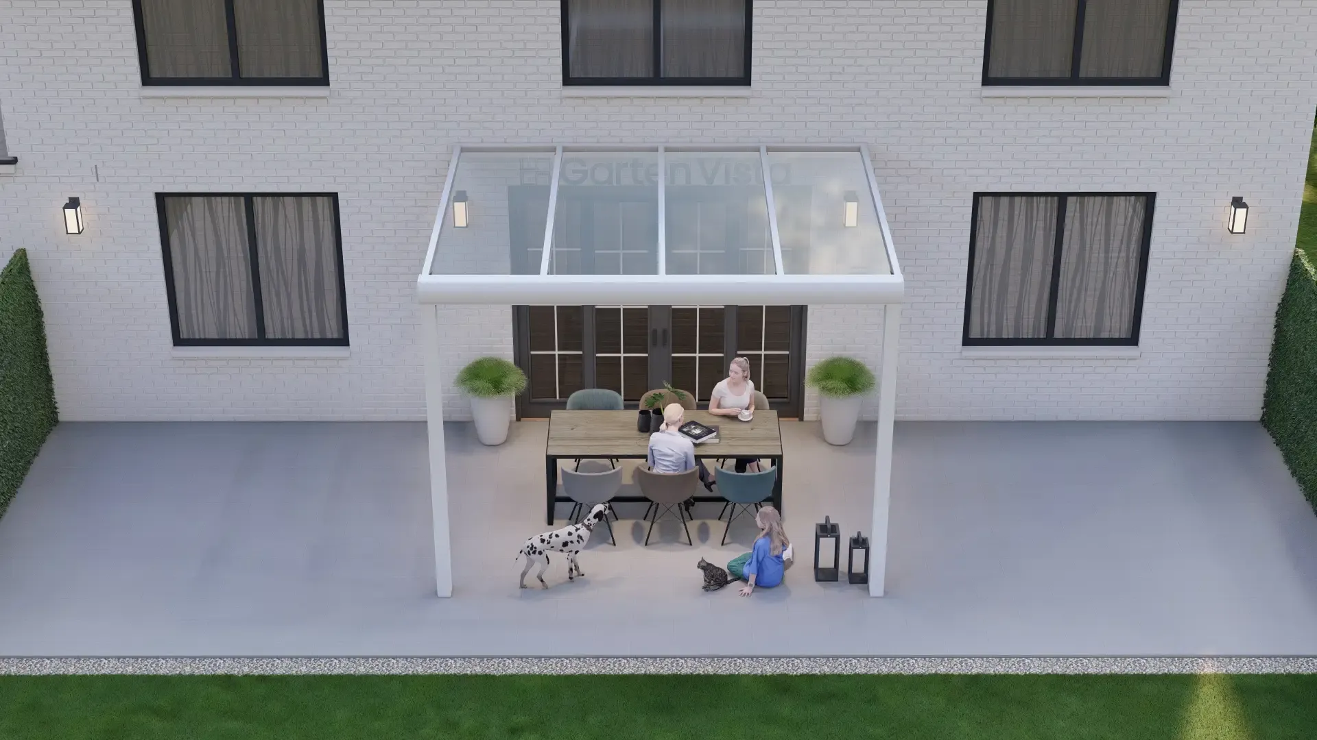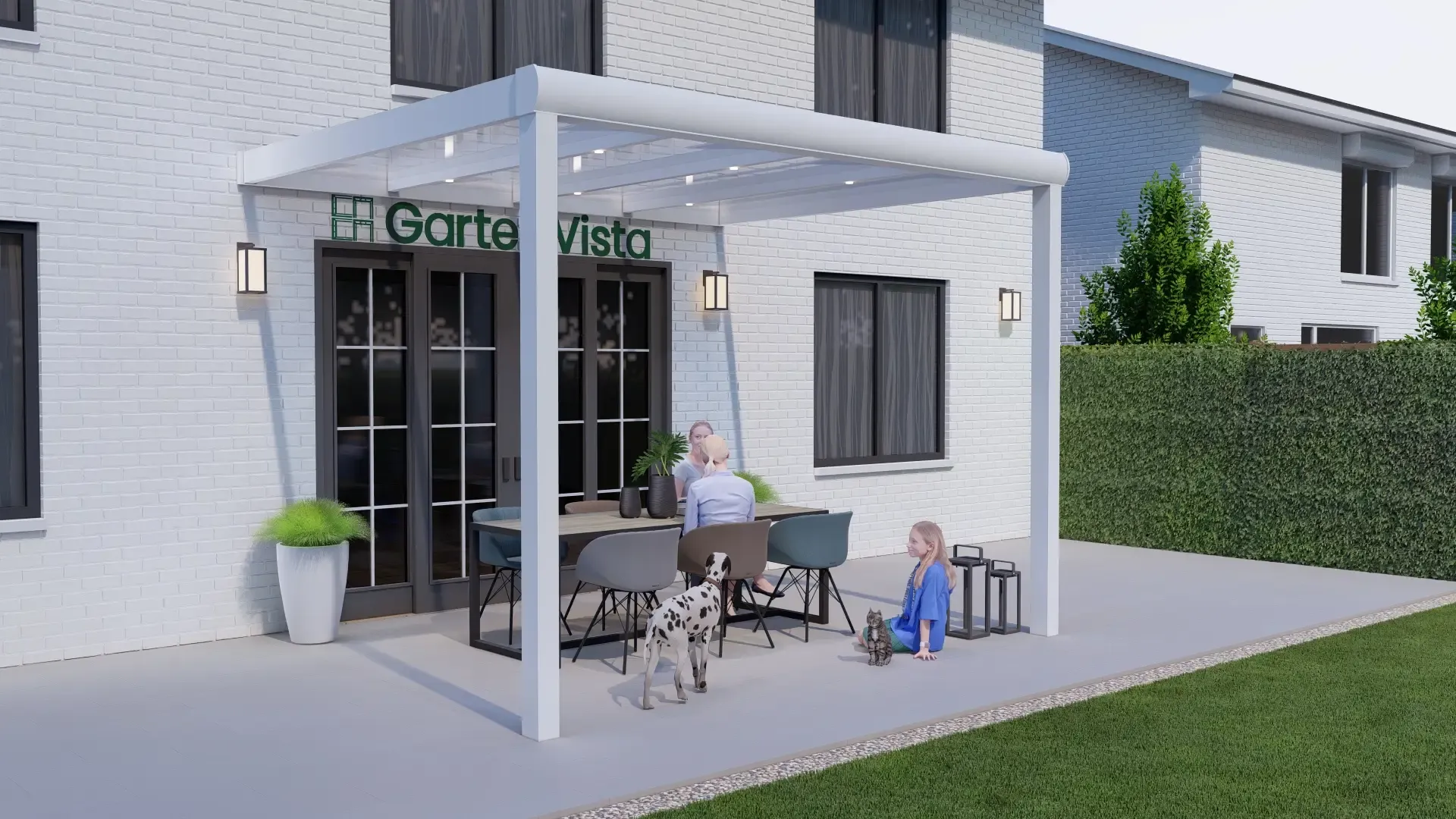 Diese Garten Vista Terrassenüberdachung mit Glasdach in der Farbe Mattweiß, mit einer Breite von 4,03 Metern und einer Tiefe von 4,0 Metern, wird von 2 Pfosten getragen. Die Pfosten haben eine Standardlänge von 2,7 Metern.