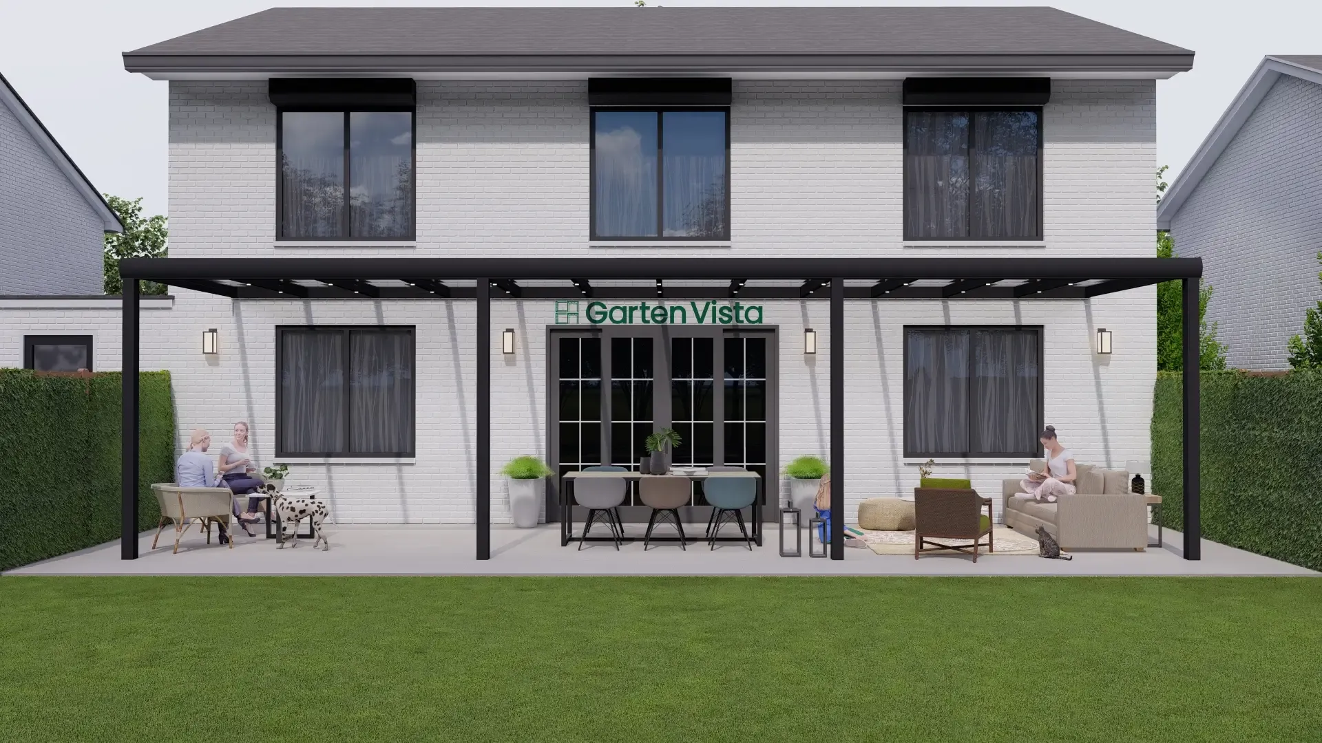 Diese Garten Vista Terrassenüberdachung mit Glasdach in der Farbe Mattschwarz, mit einer Breite von 12,03 Metern und einer Tiefe von 4,0 Metern, wird von 4 Pfosten getragen. Die Pfosten haben eine Standardlänge von 2,5 Metern.
