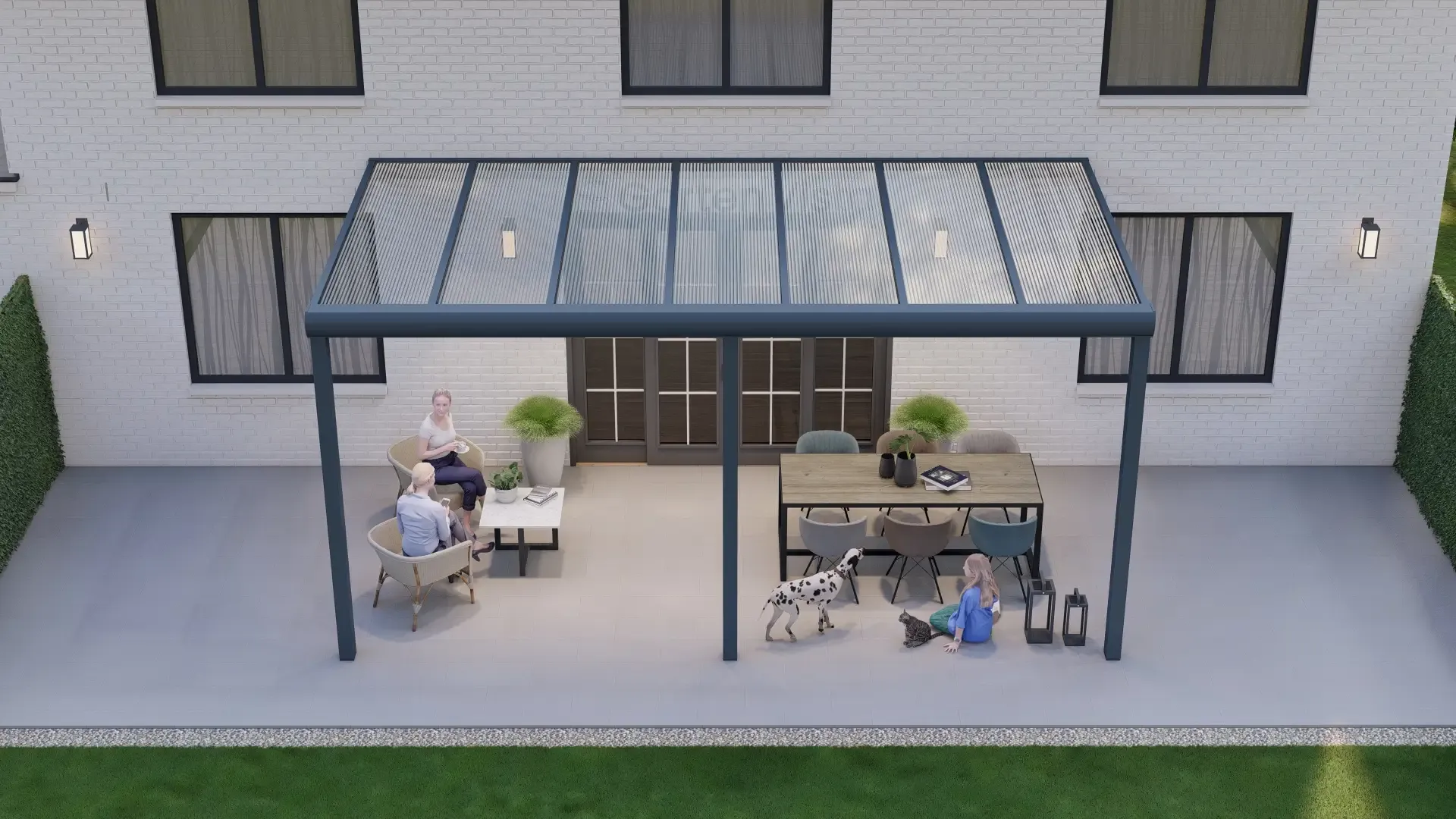 Dank eines clever konzipierten modularen Systems ist es möglich, die Überdachung später zu einem luxuriösen Gartenzimmer zu erweitern. Schließen Sie die Seite (teilweise) oder installieren Sie Glasschiebewände, damit Sie Ihren Garten auch an kühleren Tagen und Abenden herrlich genießen können. Und das alles Schritt für Schritt. Beginnen Sie mit einer Überdachung und enden Sie mit einem kompletten Gartenzimmer!